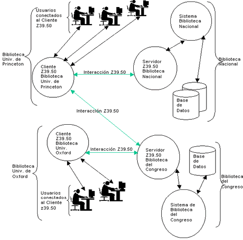Visto del lado del cliente, una aplicación que aproveche las capacidades del protocolo Z39.50, debería ofrecer la habilidad de buscar en múltiples bases de datos usando siempre una misma interfaz de búsqueda. En otras palabras, brindaría la ilusión de un repositorio de información centralizado pero que realmente está distribuido. Del lado del servidor Z, la aplicación debería ser un proveedor de la información almacenada en varias bases de datos y atender concurrentemente a varios clientes Z. A continuación se presenta el uso del protocolo en un ambiente bibliotecario: